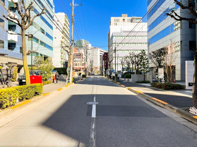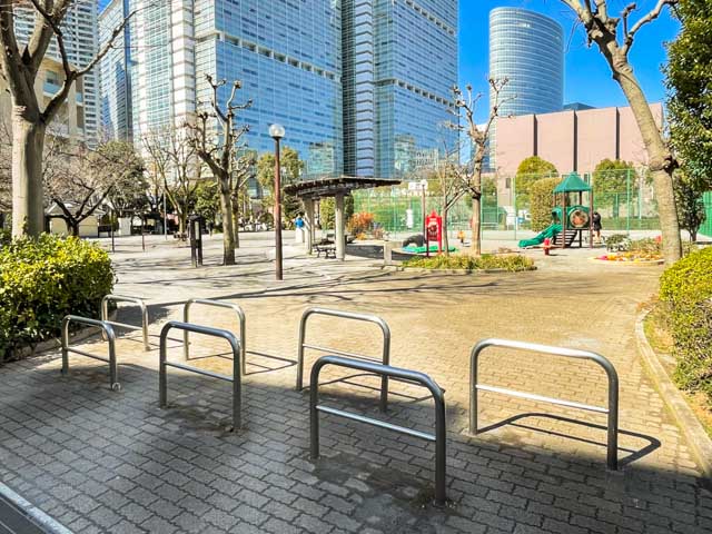 旧東海道から離れ、さらに南へと進みます。ビルが立ち並ぶエリアは、道が広いものの、さほど交通量は多くなく、安心して向かうことができます。マンションすぐのところには、広々とした公園がありますよ★