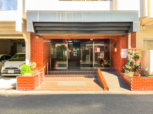 正面側は私道で、こちら側にも駐車場が設けられています。エントランスは間口が広め。スロープを完備しています。オートロックはありません。