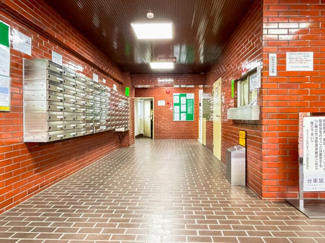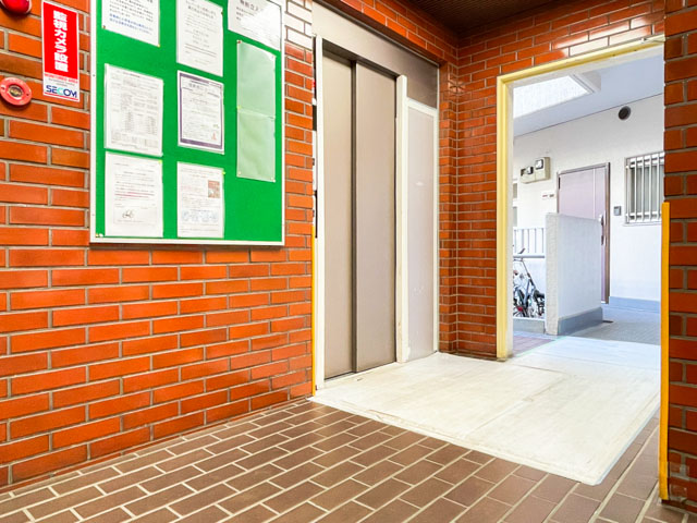 タイル貼りのエントランスロビー。こだわりが感じられますね。清掃が行き届いており、管理体制の良さがうかがえます。エレベーターは1基★