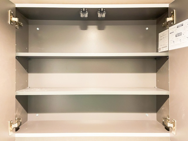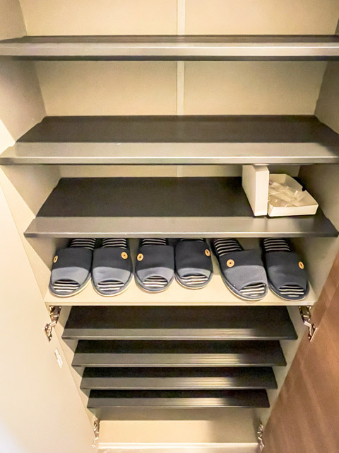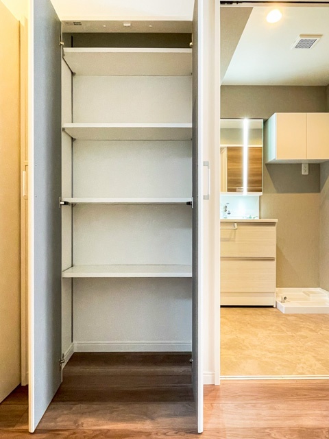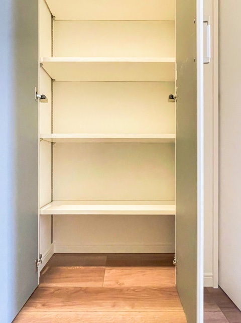 廊下部分には、シューズボックス同様、高さのある収納がふたつ並んでいます。また、奥行きも十分。棚板の高さは自由に調節することが可能です。