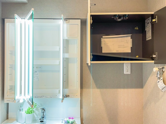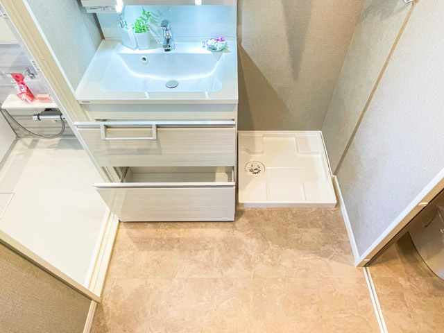 サニタリールームは洗濯機置場、洗面台ともに収納としても重宝しそう。洗面台はボウルが大きめ。限られたスペースながら、足元の広さには余裕が感じられました★