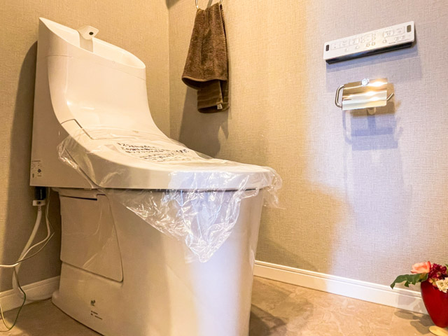 トイレは手洗い一体型を採用し、シンプルにまとめられています。備品などの収納は吊り戸棚にお任せください。