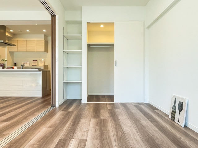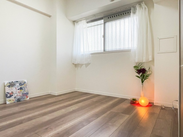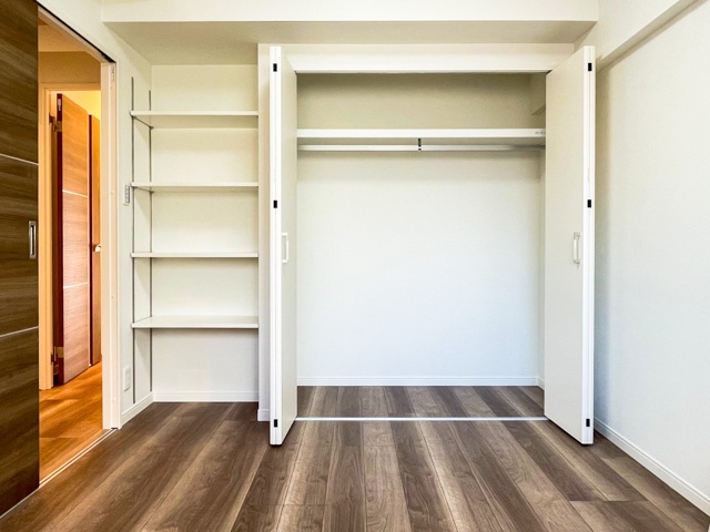 玄関すぐ右手にあるこちらは約4.5帖の広さ。窓は共用廊下側に面しており、防犯用の柵が取り付けられています。クローゼットが大きく、棚板の高さ調節が自由に行える棚なども備えており、様々な活用法が期待できます。