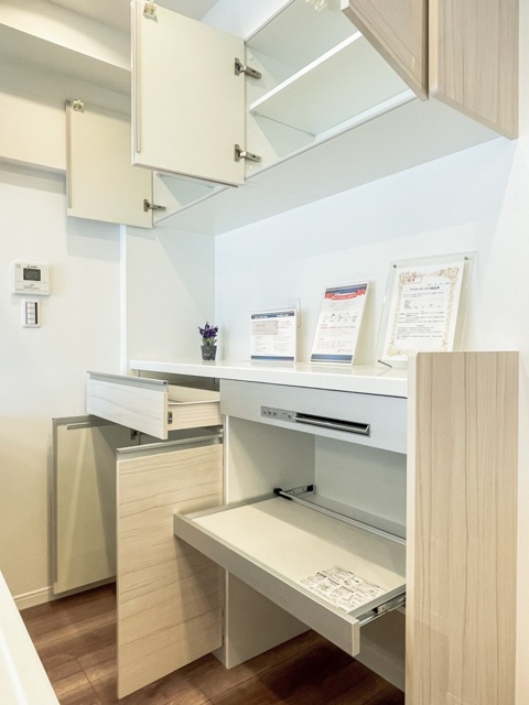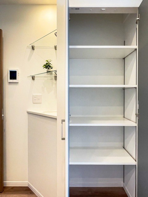 出入口〜キッチン周辺には、ニッチカウンターのほか、リビング収納が設けられています。キッチンの背面には、機能的で収納力を兼ね備えた棚も。ワークスペースとしても重宝しますよ。