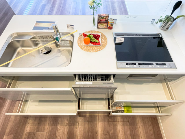 対面式のキッチンはシンクが大きく、お手入れが楽なIHタイプのコンロや、食洗機なども備わっています。収納力も申し分ありませんね☆