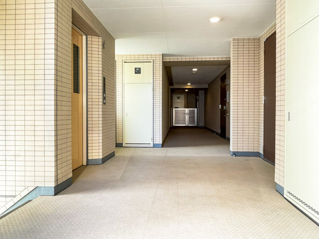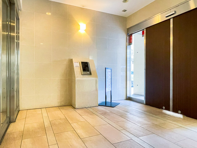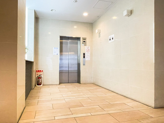 エントランスはオートロックを採用しており、安心感がありますね。自動ドアを抜けると広々とした空間が広がり、奥に1基のエレベーターが設置されています。