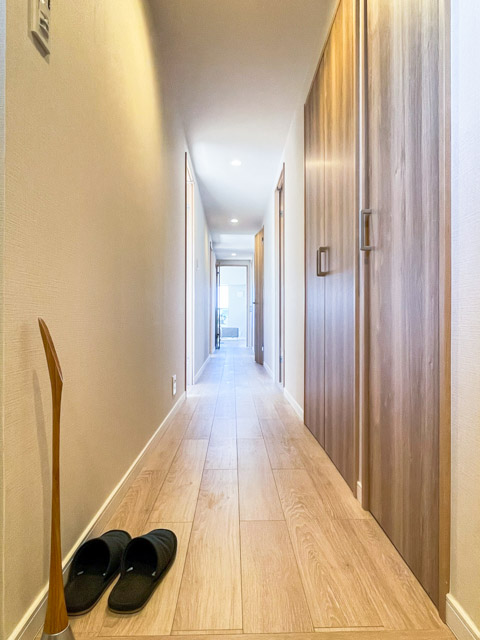 靴は広々としたシューズボックスにお任せください。廊下はリビングダイニングまで、まっすぐ続いています。