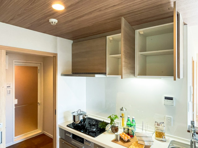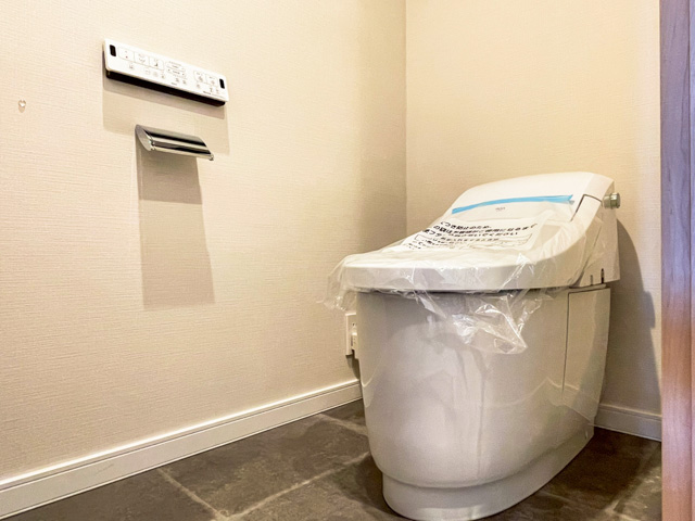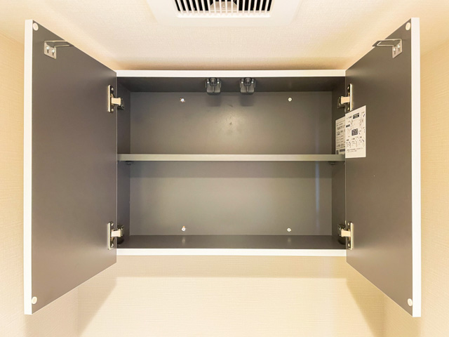 タンクレスタイプのトイレを採用し、空間をすっきりと仕上げています。吊り戸棚はほどよいサイズ。