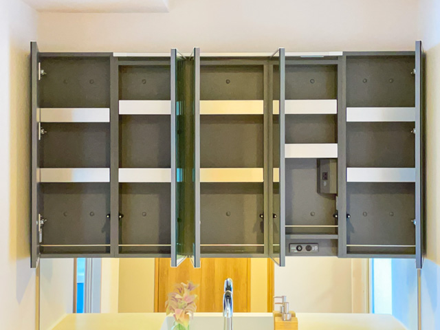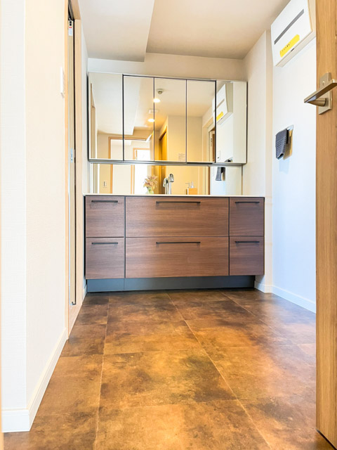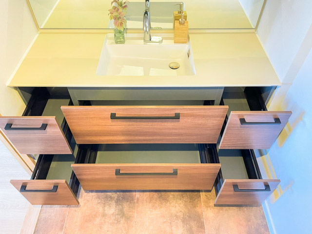 洗面台はゆったりとした横幅で、ワークトップが広々としています。また、収納のバリエーションが豊富で、整理整頓がはかどりますよ★