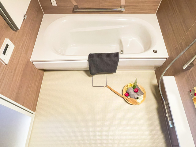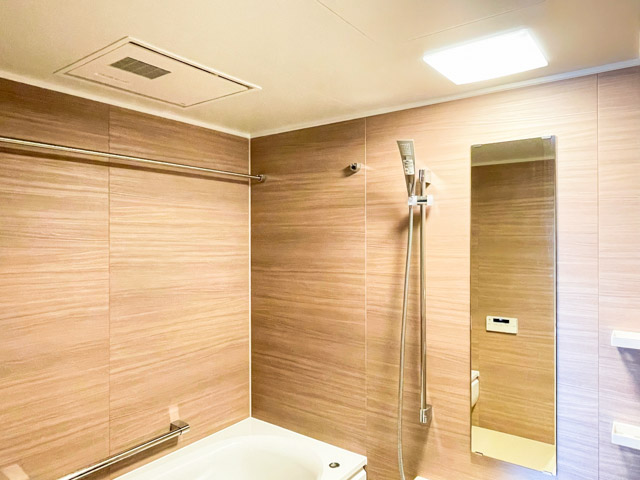 バスルームは木目のパネルをあしらい、落ち着いた空間に仕上げています。追い焚き機能や浴室乾燥機など、設備面もかなりの充実度。