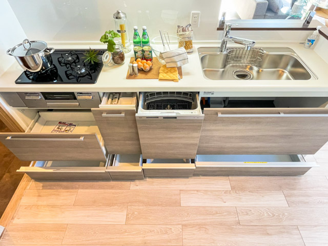 キッチンはサニタリールームからも出入り可能。収納が多く、ワークトップやシンクが大きめ。三口コンロや食洗機など、設備も充実しています★