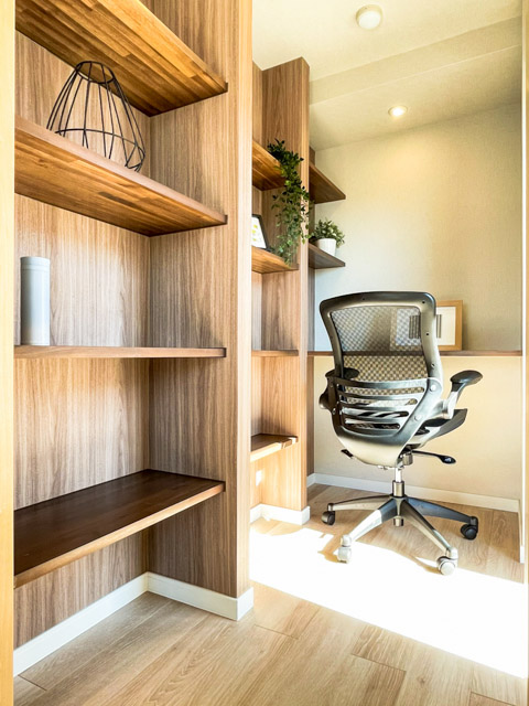 こちらはリビングダイニングの一角に設けられた書斎で、広さは約1.9帖。陽当たりも良好です。