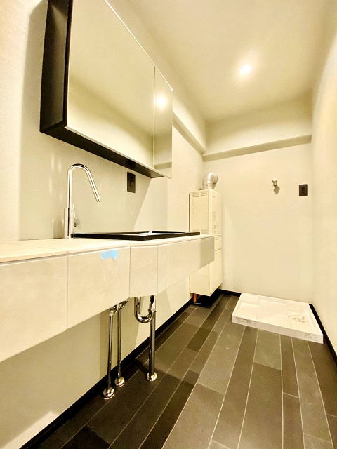 サニタリールームは広々としたスペースを確保しています(^_^)急がしい朝も、リラックスしてゆったりと身支度ができるので嬉しいですね♡ミラーキャビネット仕様で収納力も豊富★