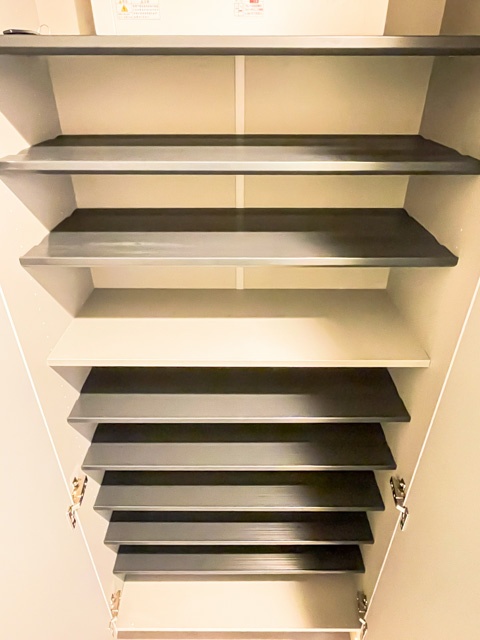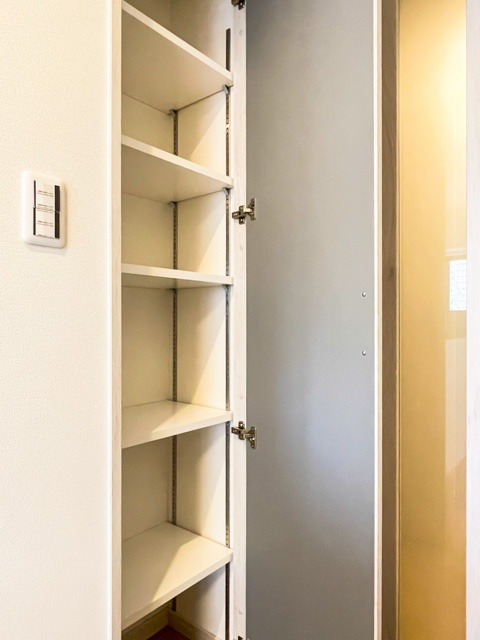 廊下部分には複数の収納を完備。高さは天井に至りますが、幅が違うのは、デッドスペースをくまなく活用した結果と言えるのではないでしょうか★