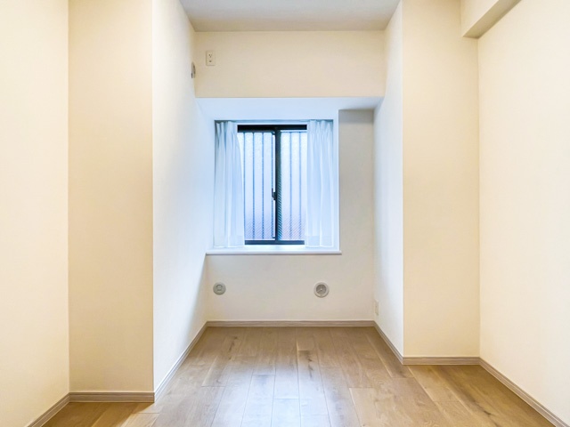 こちらは玄関からみて左手に位置する洋室です。広さは約5.4帖。先ほどのお部屋とは違い、クローゼットには扉が設けられています。どちらの洋室も窓は廊下側にあり、防犯用の柵が取り付けられています。