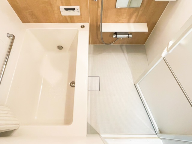 バスルームは木目のパネルをあしらい、落ち着いた仕上がりに。バスタブが大きめで、追い焚き機能や浴室乾燥機も完備していますよ★