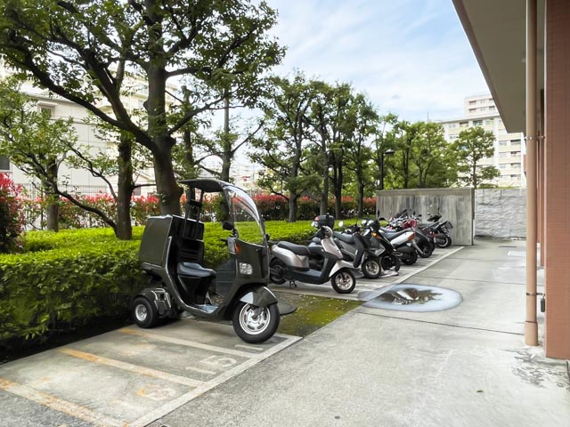 駐車場は裏手に設けられており、広さも十分。バイク置場にも十分な余裕がありますよ。